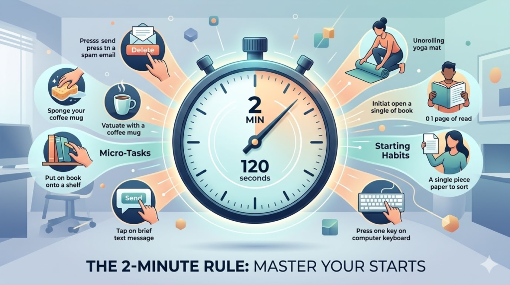 We all have those tiny tasks—sending a quick email, hanging up a coat, or filing a document—that we put off because they seem “too small” to matter. However, these small tasks accumulate into a mountain of mental clutter that leads to burnout and stress.Early in my productivity journey, I realized that the hardest part of any task isn’t the work itself; it’s the starting. This is where the 2-Minute Rule comes in. Borrowed from David Allen’s “Getting Things Done” (GTD) methodology and popularized further by James Clear in “Atomic Habits,” this rule is the simplest yet most effective weapon against procrastination.1. What Exactly is the 2-Minute Rule?The concept is deceptively simple: If a task takes less than two minutes to complete, do it immediately.Don’t add it to a to-do list. Don’t set a reminder for later. Don’t think about it. Just do it.The Psychology Behind the RuleWhy is 2 minutes the “magic number”? It’s because two minutes is a short enough window that your brain cannot justify an excuse to avoid it. We often procrastinate because we perceive tasks as large, looming obstacles. By committing to just two minutes, we lower the “activation energy” required to start.Once you start a task, the Zeigarnik Effect kicks in—a psychological phenomenon where our brains remember incomplete tasks more than completed ones. By starting for two minutes, your brain naturally wants to finish what it began.2. The Two Versions of the RuleTo truly master this principle, you need to understand its two distinct applications:Version A: The Immediate Completion (For Small Tasks)This is for the “micro-tasks” that clutter our lives. If you see a piece of mail on the counter, don’t leave it there—sort it now. If you finished your coffee, wash the mug now. By doing these tasks immediately, you prevent the “pile-up” effect.Version B: The “Starting” Ritual (For Large Goals)How do you apply a 2-minute rule to writing a book or running a marathon? You focus on the first two minutes.Goal: Read more books $\rightarrow$ 2-Minute Version: Read one page.Goal: Practice Yoga $\rightarrow$ 2-Minute Version: Take out your yoga mat.Goal: Study for an exam $\rightarrow$ 2-Minute Version: Open your textbook to the first chapter.The idea is to make your habits as easy as possible to start. You can’t improve a habit that doesn’t exist.3. Why This Rule is a “Game Changer” for Mental HealthProcrastination isn’t a time-management problem; it’s an emotion-regulation problem. We avoid tasks because they make us feel anxious, bored, or overwhelmed.When we let small tasks pile up, our brain enters a state of constant “background processing.” This leads to decision fatigue. Every time you look at a messy desk or an unread message, you are making a subconscious decision to “do it later,” which drains your willpower.The 2-Minute Rule clears this background noise. It provides a sense of “small wins,” which releases dopamine and builds the momentum needed for larger projects.4. The 20-Task Checklist: Clean Up Your Life in 2 MinutesTo help you get started, here are 20 tasks that take 120 seconds or less but will drastically improve the quality of your daily environment and mental space.Digital DeclutterUnsubscribe from 3 junk emails: Stop the clutter before it reaches your inbox.Clear your desktop: Move random files into a “to-process” folder or delete them.Respond to that one “hanging” text: Close the loop on a social obligation.Delete 5 blurry photos: Free up cloud storage and mental space.Physical EnvironmentMake your bed: It sets the tone for the entire day.Wipe down the kitchen counter: A clean surface invites calm.Water one plant: A small act of nurturing.Hang up your coat/bag: Don’t just drop it on the chair.Empty the trash can: Remove the physical “waste” from your view.File one piece of paper: That bill or receipt that’s been sitting out.Mental & Personal GrowthWrite down your Top 3 goals for tomorrow: Reduce morning anxiety.Do a “Brain Dump”: Spend 2 minutes writing down everything stressing you out.Stretch your neck and shoulders: Physical tension often mirrors mental tension.Take 5 deep breaths: Reset your nervous system.Put one item in a “to-donate” box: Practice the art of letting go.Professional EfficiencyClean your computer screen/glasses: Clarity of sight leads to clarity of thought.Organize your pens and stationery: Remove the friction of “searching for tools.”Update your calendar: Add that one event you’ve been meaning to record.Send a “Thank You” note: Build professional relationships in seconds.Clear your browser tabs: Close anything that isn’t essential to your current task.5. Common Pitfalls: When the 2-Minute Rule FailsWhile powerful, the rule can be misused. Here is how to avoid the traps:The Trap of “Fake Work”: Don’t use the 2-Minute Rule to avoid your most important, difficult task (The “Eat the Frog” principle). Doing 50 small tasks but ignoring your main project is still procrastination.The Trap of Interruption: If you are in a state of “Deep Work,” do not stop to wash a mug just because it takes 2 minutes. The rule is for transitions or when you are in maintenance mode.Overestimating Time: Some tasks look like they take 2 minutes but actually take 20. If you start a “quick” closet clean and it turns into a 2-hour project, you’ve broken the rule. Be strict with the clock.6. How to Build the “2-Minute Habit”Start small. I recommend choosing just one time of day—perhaps right after you walk through the front door after work—to apply the rule religiously for one week.Notice how the physical space around you begins to open up. Notice how the “nagging voice” in your head starts to quiet down. Productivity isn’t about working harder; it’s about removing the friction that stops you from working at all.